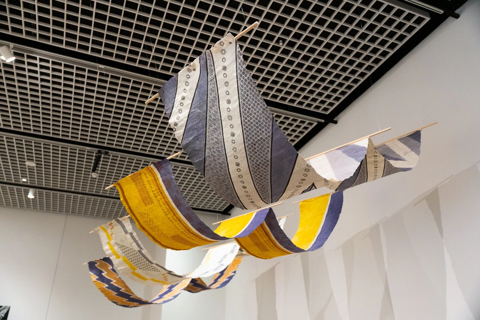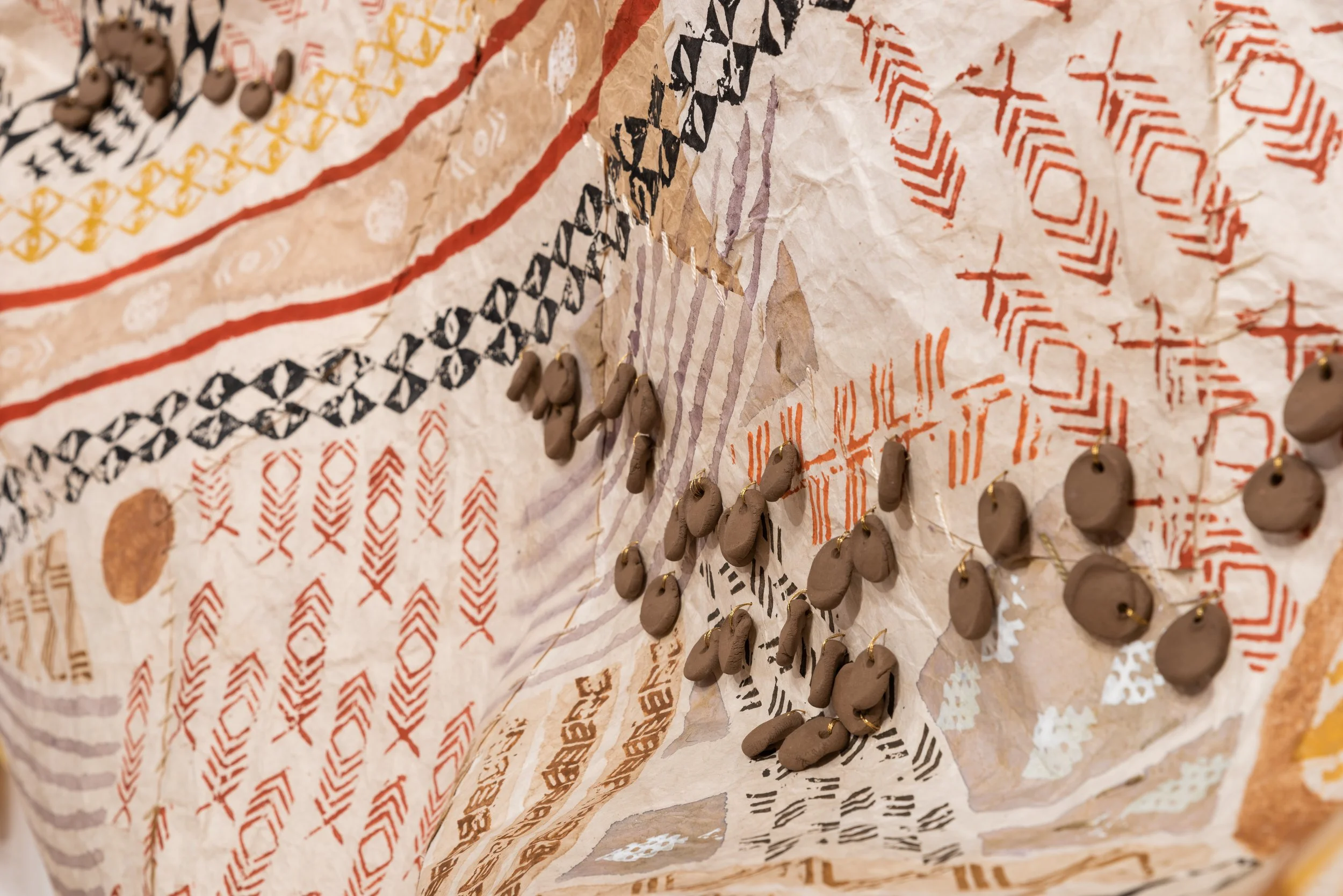 “The works here offer a glimpse into my experimentation and processes of working with forms that expand upon the uses of traditional kapa (barkcloth) as a primary medium. From suspended installation, to large-scale wall-based ‘quilts,’ wearable objects, and mixed-media approaches, these pieces push the boundaries of this ancestral material while acknowledging its deep cultural history and significance. These visual forms and installation methods, innovative and contemporary in nature, are not things you’d see my ancestors doing hundreds of years ago. Nevertheless, the roots of these textiles and organic media continue to resonate through my intentional materiality, use of customary motifs, and emphasis on elevating craft as fine art.”