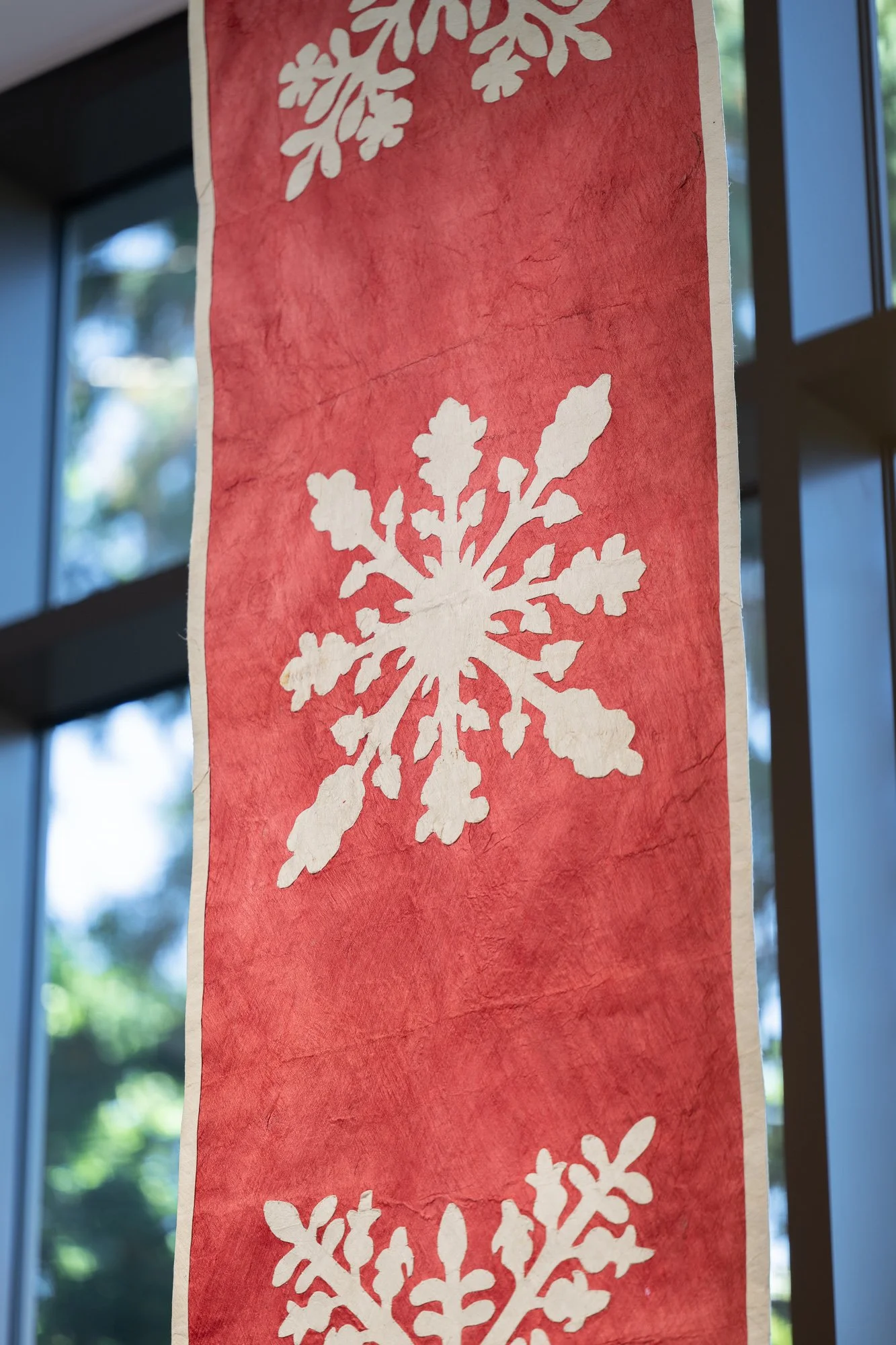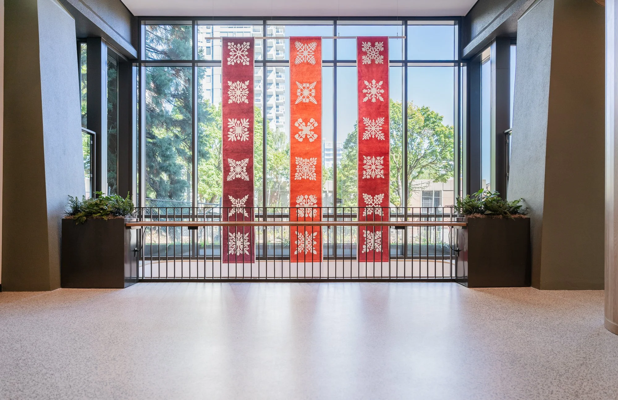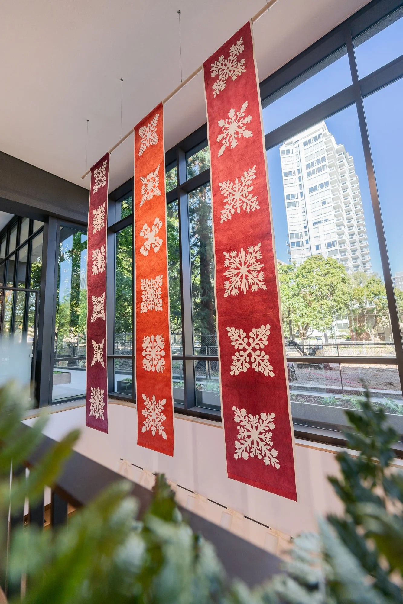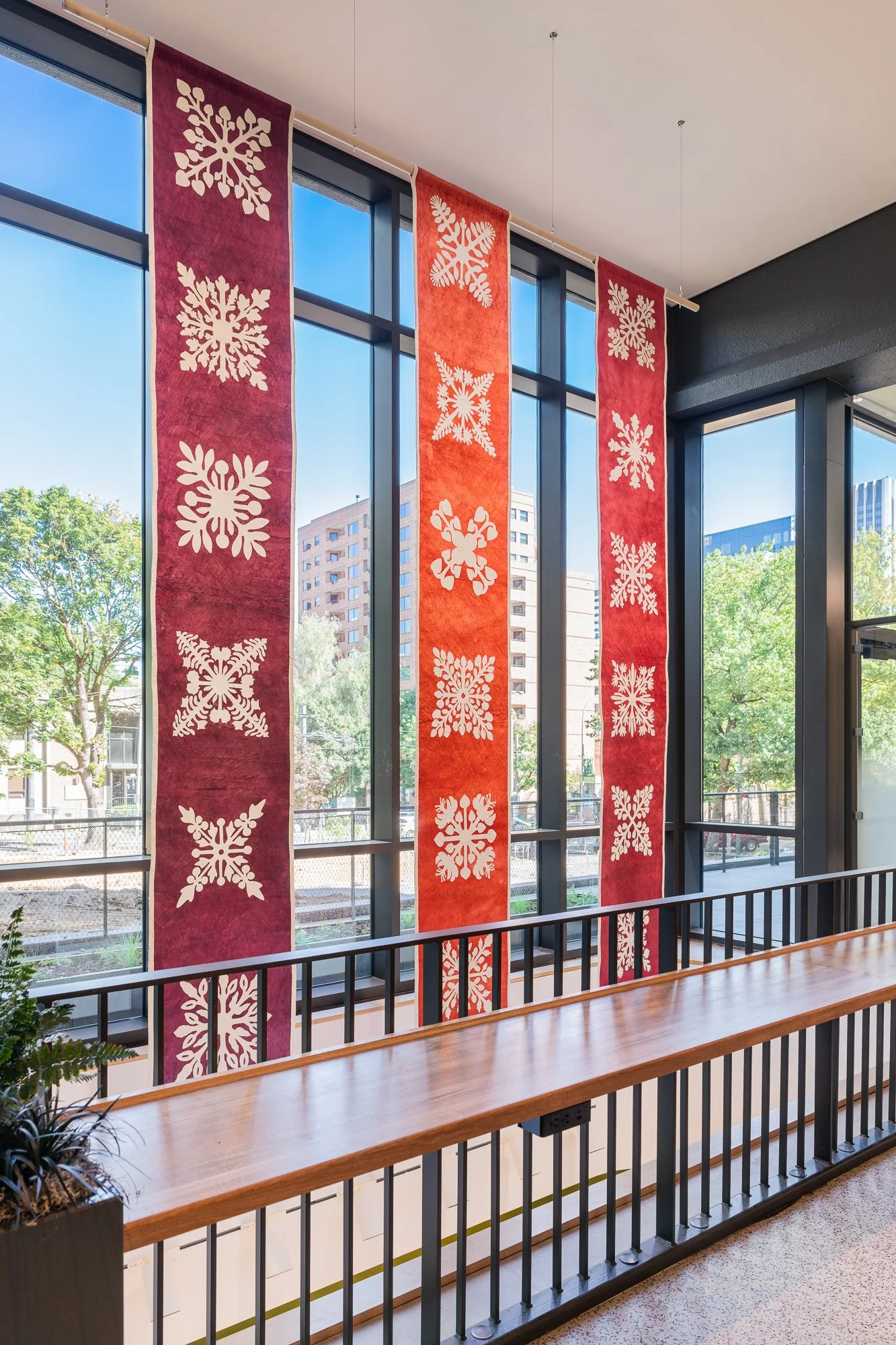Hoʻoulu Pū (Growing Together) [installation view]. Dyed kapa (barkcloth) tapestries and hand-stitched appliqué. 15 feet H x 10 feet W. 2024. Commissioned by the Oregon Arts Commission.