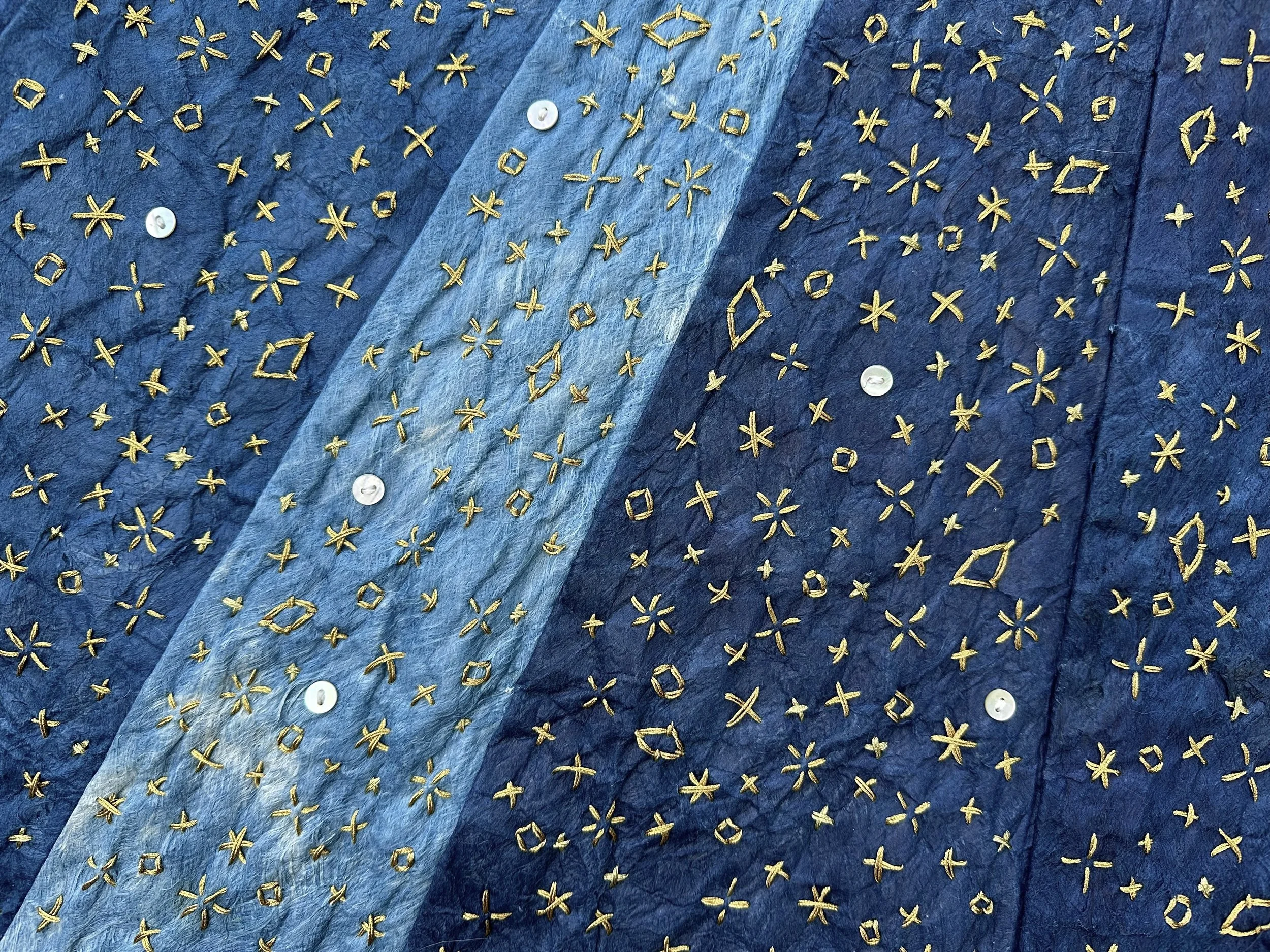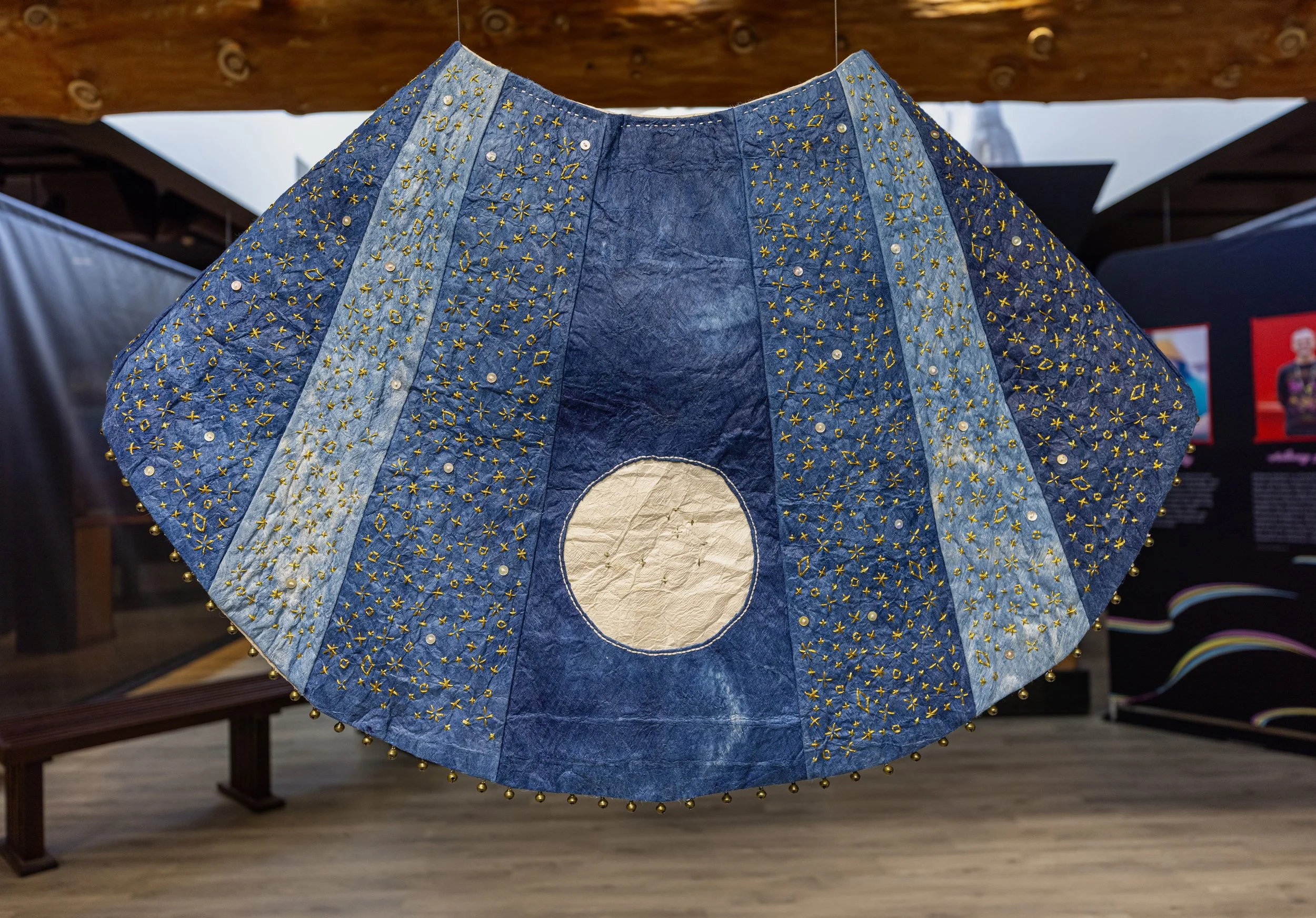 Since the Beginning and End of Time (installation view). Indigo-dyed kapa, hand-embroidery, shell buttons, bells. Approx. 44 inches H x 50 inches W. 2024.