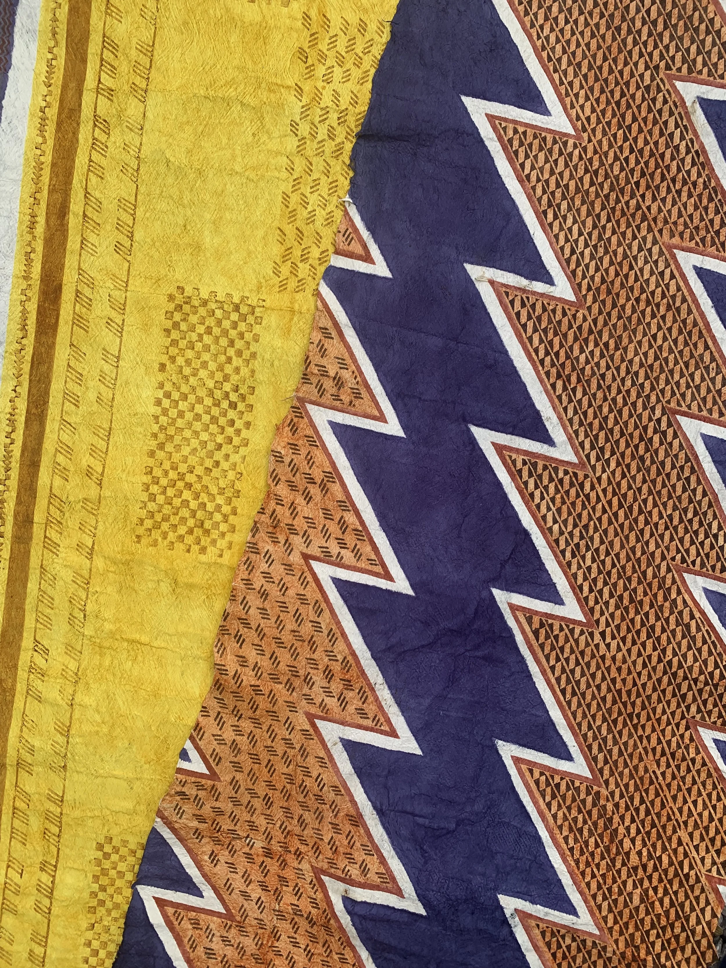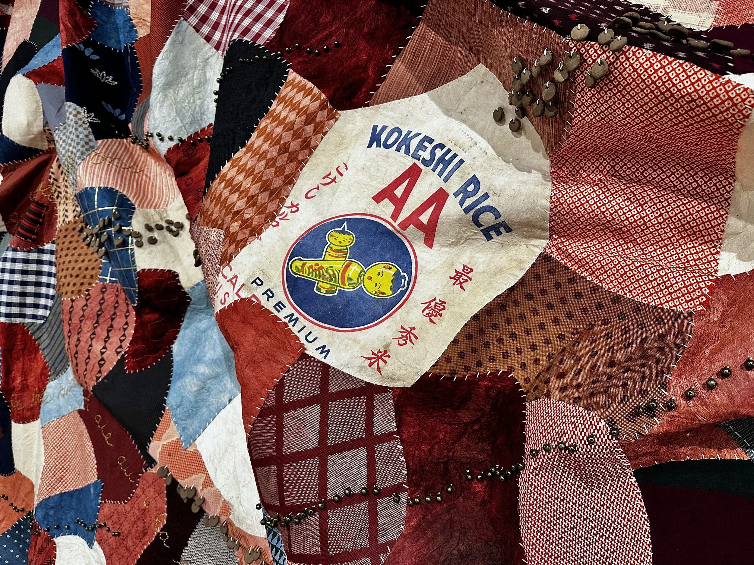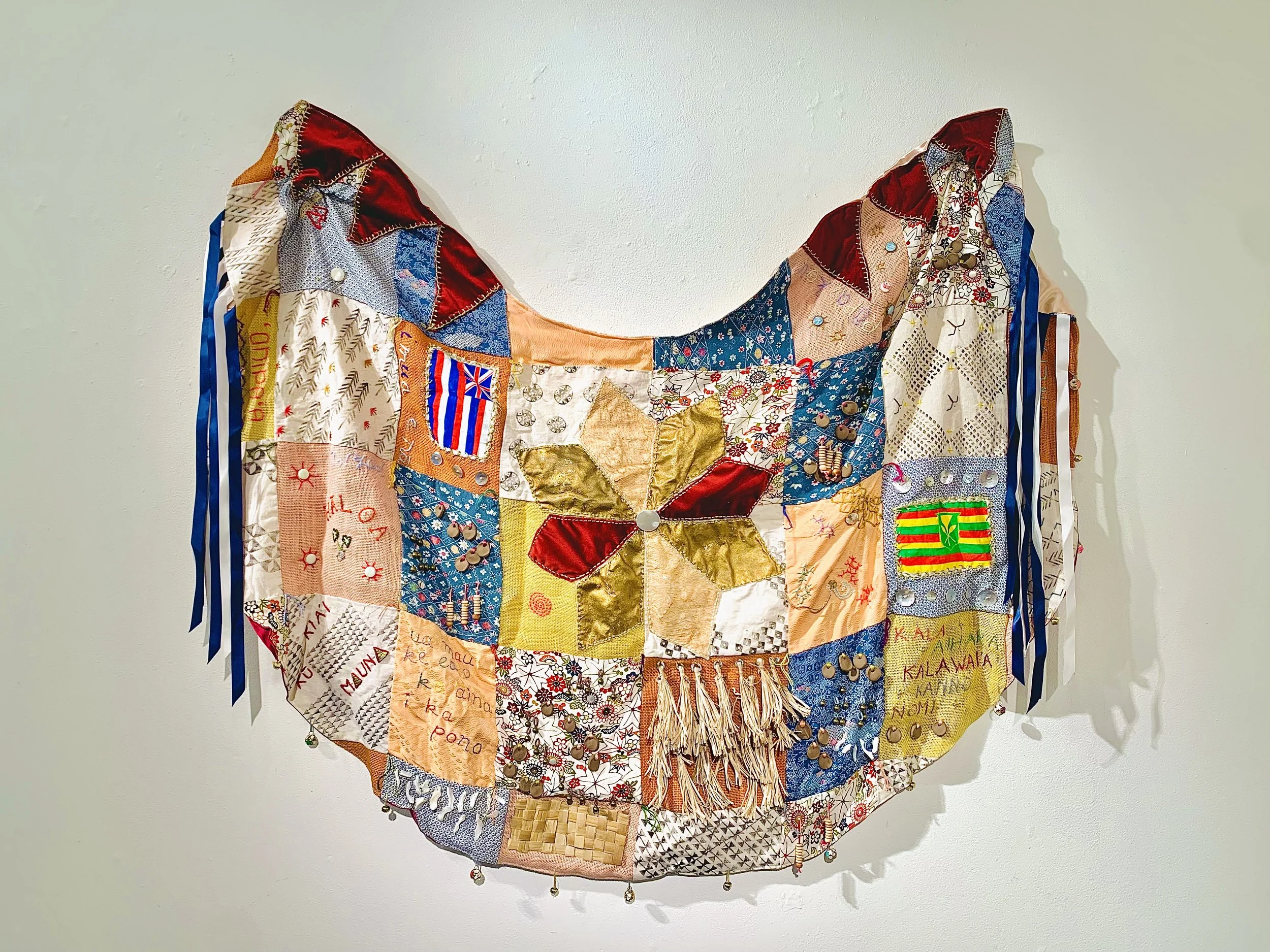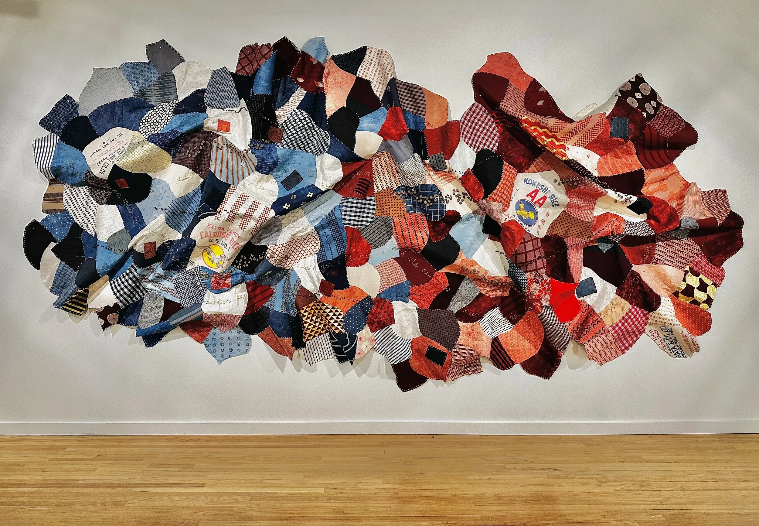 This installation is part of a larger body of mixed-textile works that seek to empower my community through the celebration of the cultural intersections that we collectively embody. Like so many who call Hawaiʻi home today, I was raised within my Native Hawaiian and Japanese heritages, growing up learning both languages and taking part in practices unique to each community. Despite so much cultural overlap in the roots of my upbringing, there are many complex intersectional histories that were often overlooked or understated, including racial conflict, economic disparity, displacement, and social assimilation. This piece seeks to address these long-spanning themes by incorporating textile traditions and narrative patterns specific to both my Native Hawaiian ancestors and my Japanese ancestors who left their country to work on plantations. By individually hand-stitching each textile fragment together, this ‘quilt’ intentionally mirrors the many generations of intricate, interwoven cultural relationships unique to Hawaiʻi and its people. The traditional textiles used throughout our lives, such as kapa and silk, are inherently reflective of place, time, and connection, and by combining them in a manner that honors their uniqueness yet blurs the line between them, I aim to represent these narratives through a quilt greater than the sum of its parts.