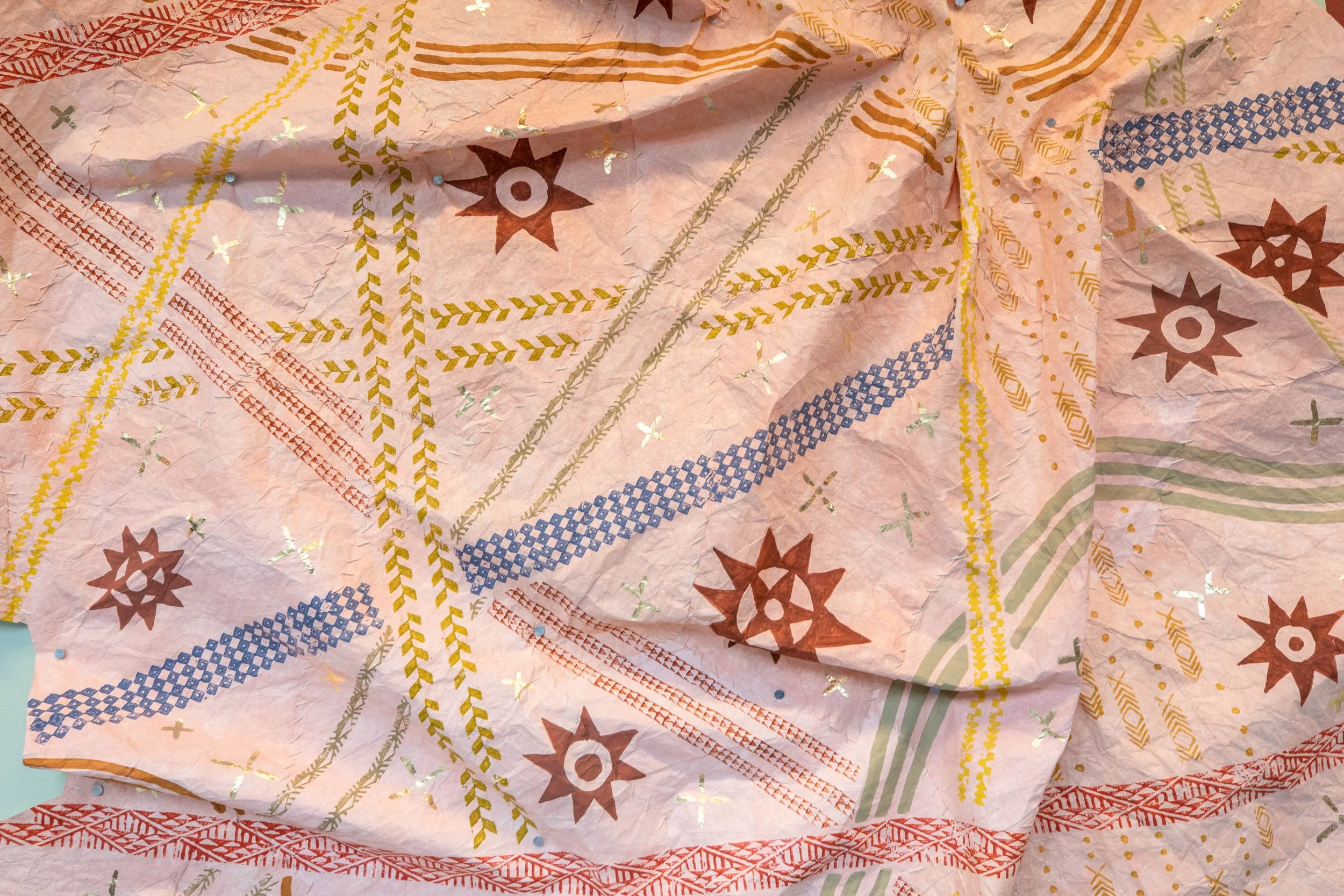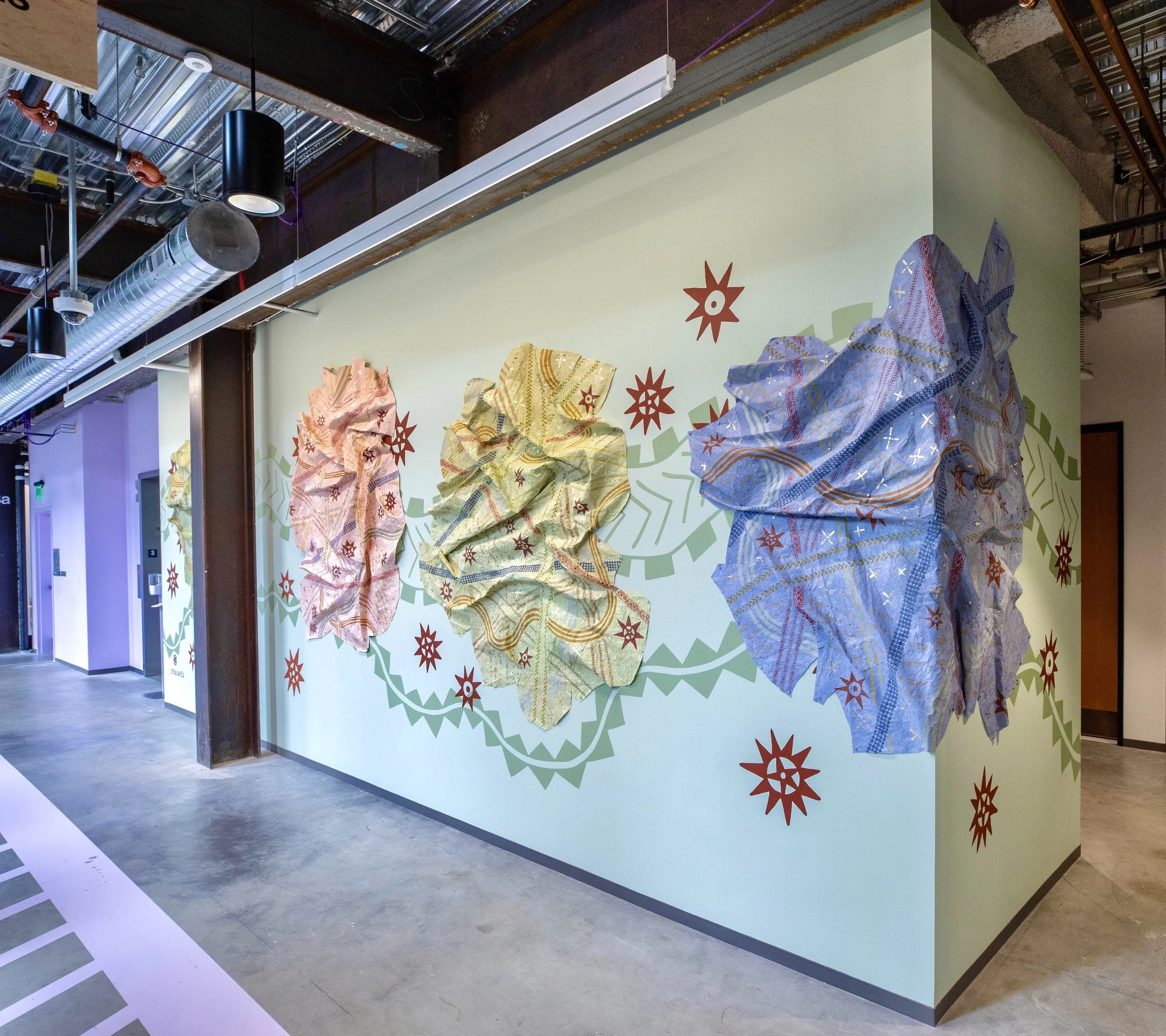 Ka Muliwai, Ke Ola (The Estuary, The Life) [installation view]. Acrylic ink, thread, gouache, metal leaf, Tyvek. Approx. 10 feet H x 30 feet W. 2022. Commissioned by Meta Open Arts.
