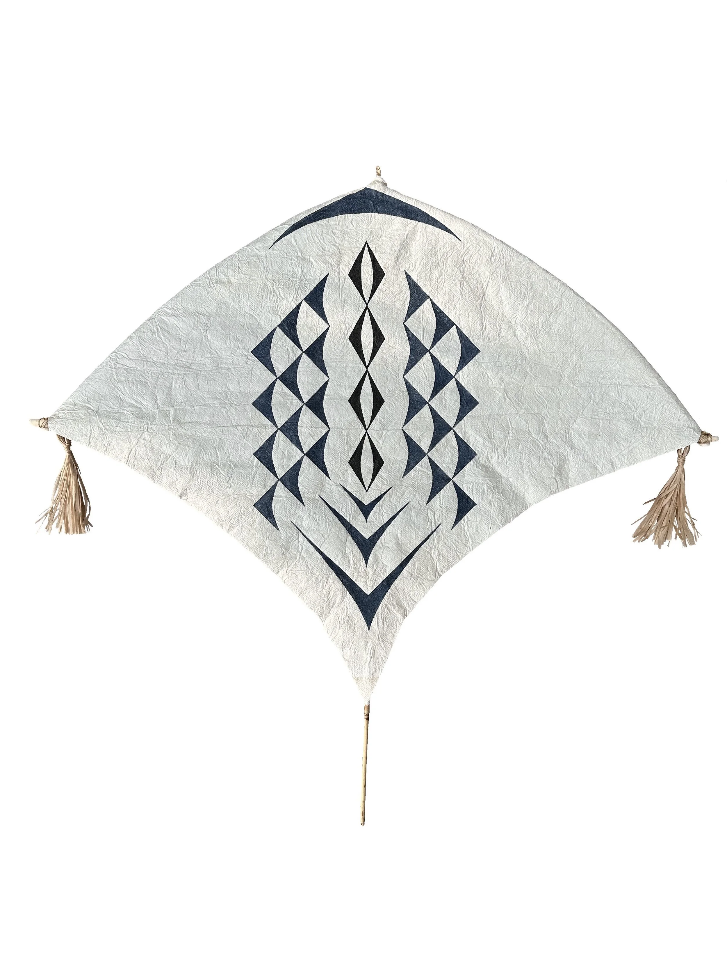 Lupe Hīhīmanu (Manta Ray Kite). Earth pigments, hibiscus cordage, bamboo, kapa (barkcloth). Approx. 33 inches H X 32 inches W.