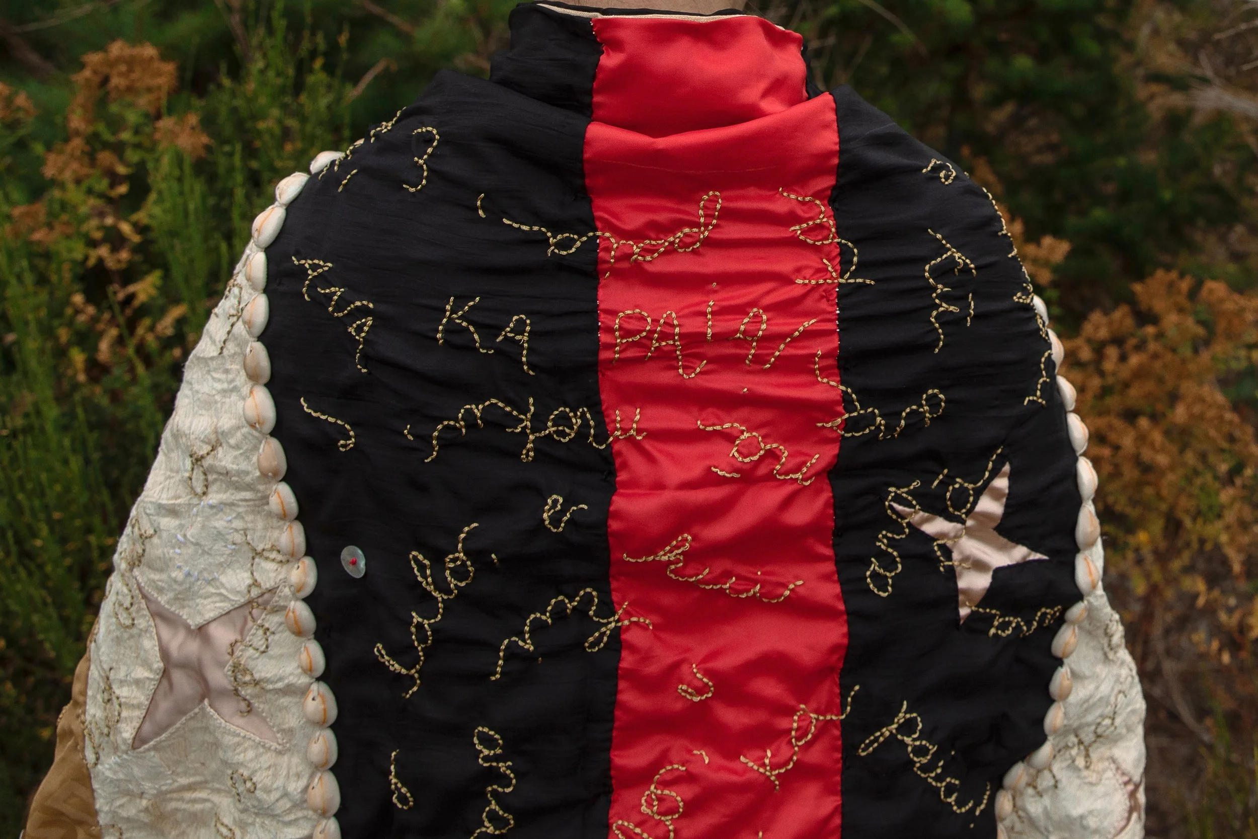 ʻAʻahu Hoʻokahuli Aupuni (Cloak of the Revolution). Hand-embroidery and shells on kapa, kimono silk, bridesmaids’ dress fabric. 2020.