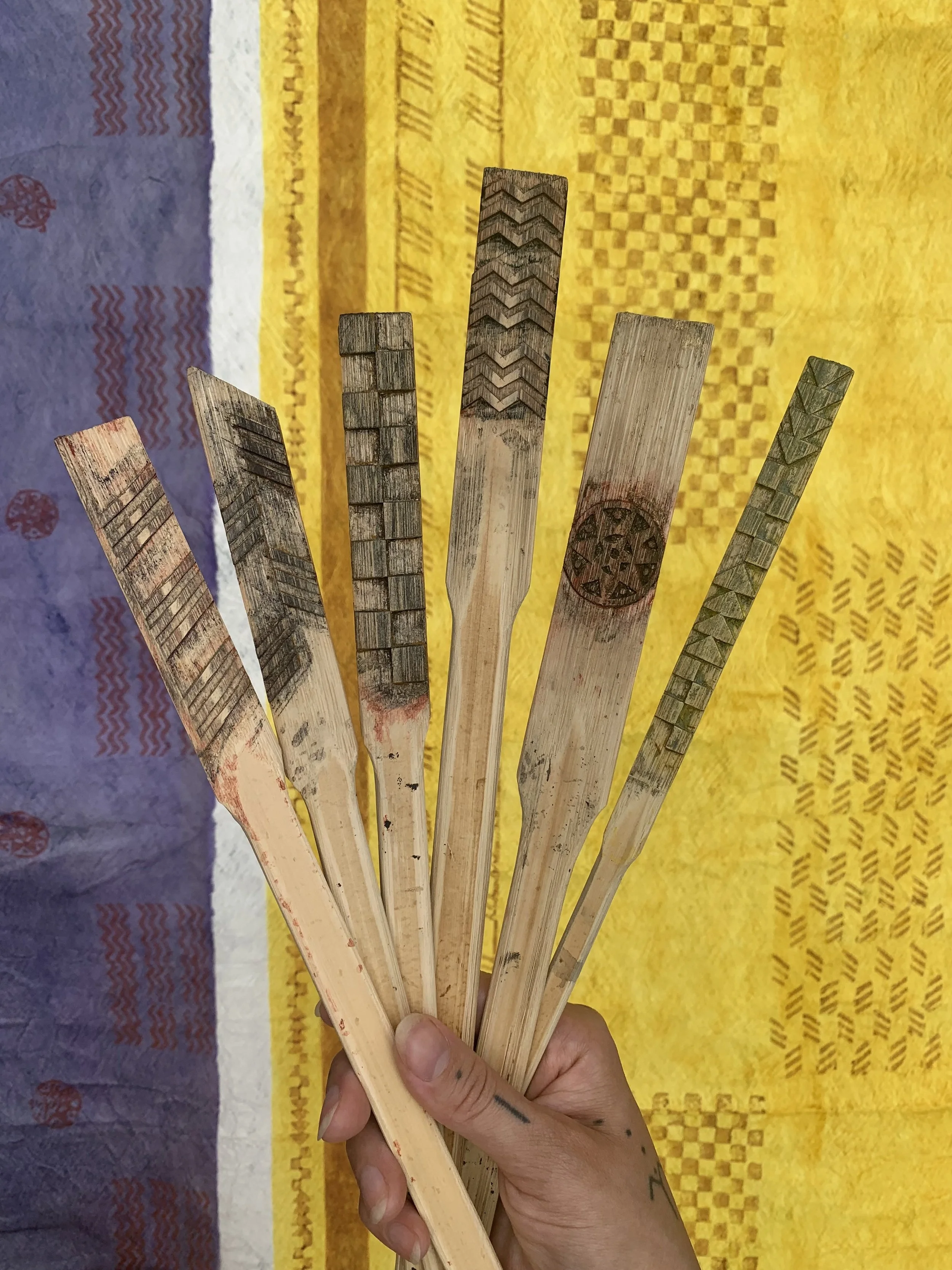 An assortment of ʻohe kāpala stamping tools used to make Ka ʻŌhū Loa O Ke Kai Uli