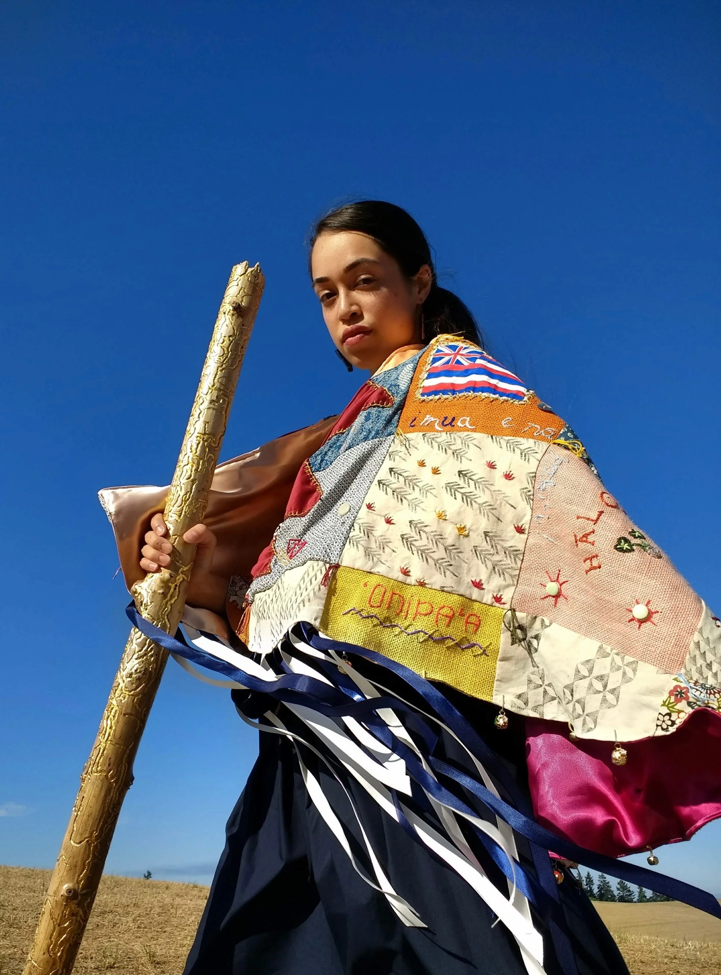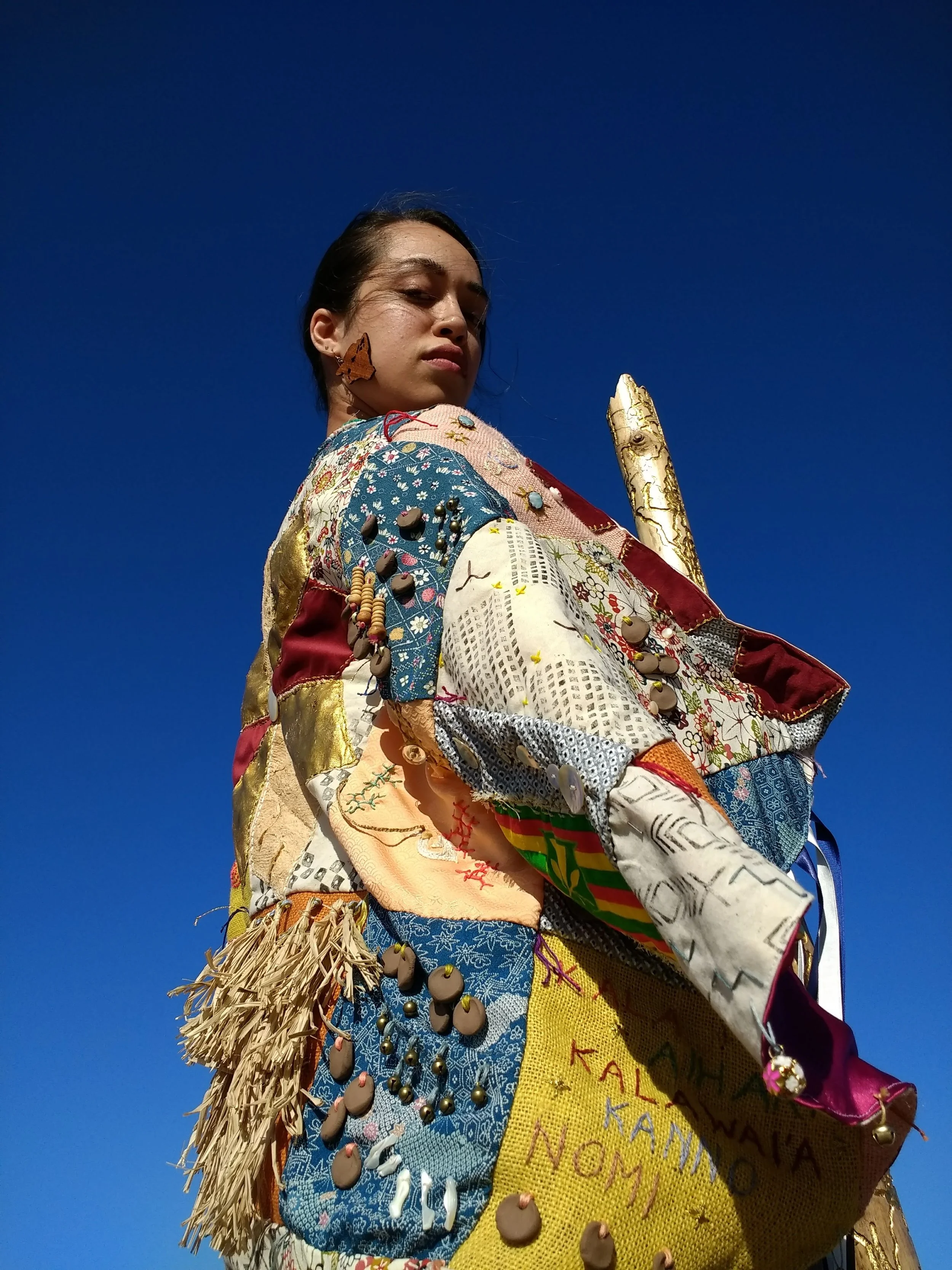An ongoing series of hand-stitched wearable cloaks made using Hawaiian barkcloth and Japanese kimono silk from the artist’s family. Each cloak is modeled after the shape of traditional Native Hawaiian ʻahuʻula (feathered capes), and tell a unique story about the artist’s personal identity — relating to community, family lineage, and cultural preservation. The dense adornment, patchworking of different fabrics, and hand-embroidery become a meditative way of paying homage to one’s heritage.