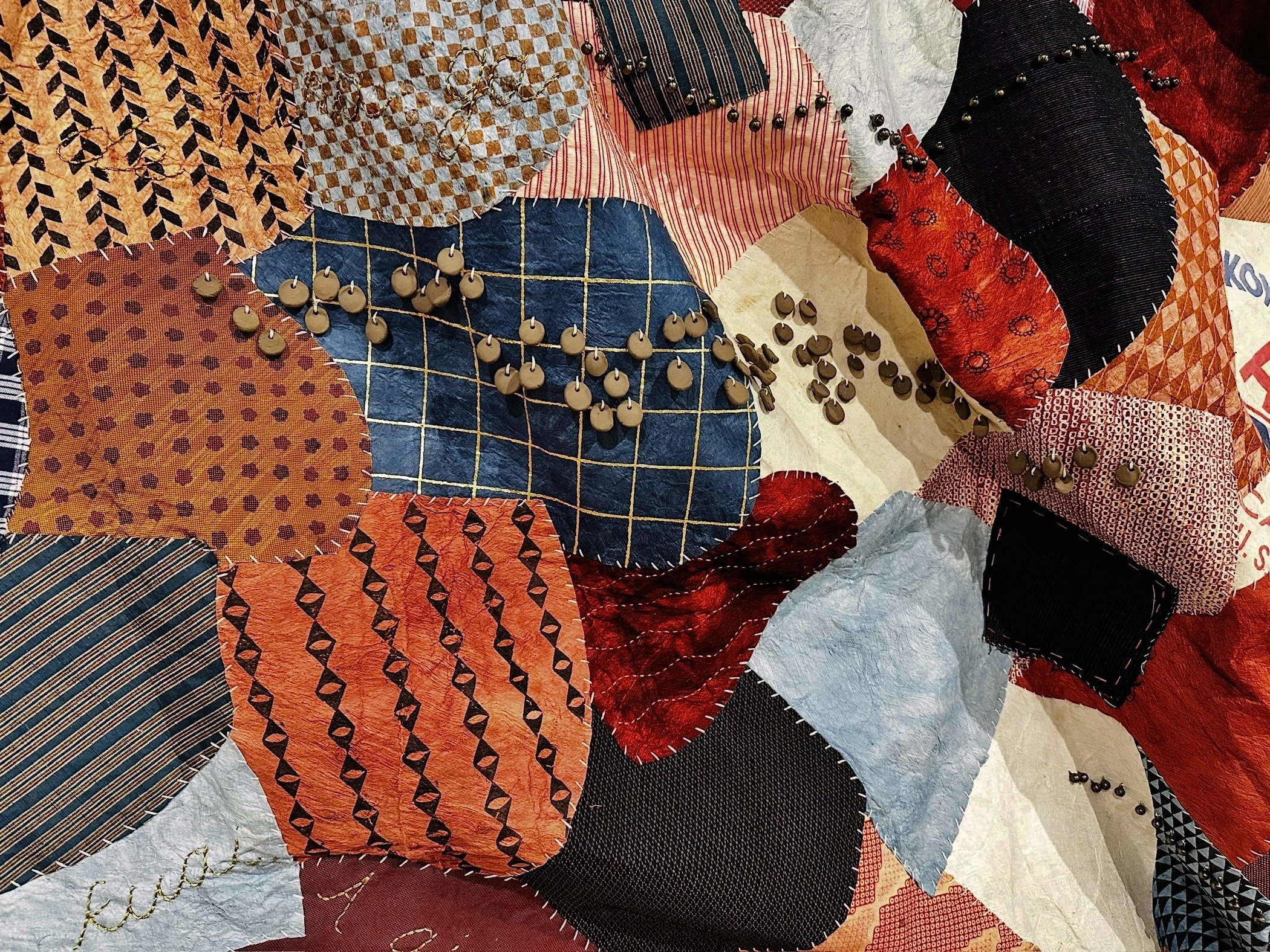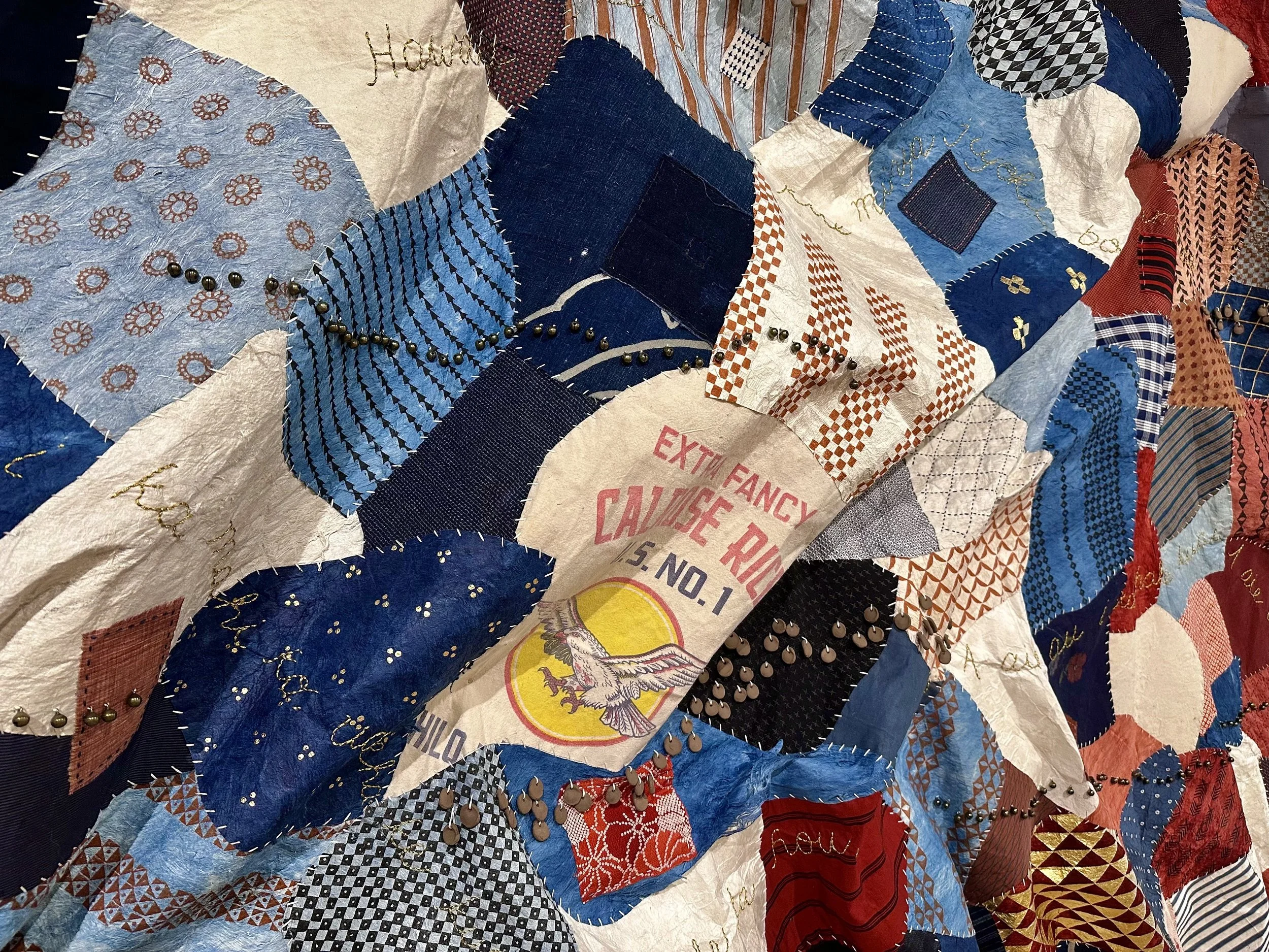 Still Finding My Way Back Home. Kapa, reclaimed Japanese fabrics, vintage rice bags, indigo and madder root dyes, ceramic beads, bells, earth pigments, hand-embroidery. Approx. 9 feet H x 17 feet W. 2025. Collection of the Crystal Bridges Museum of American Art.