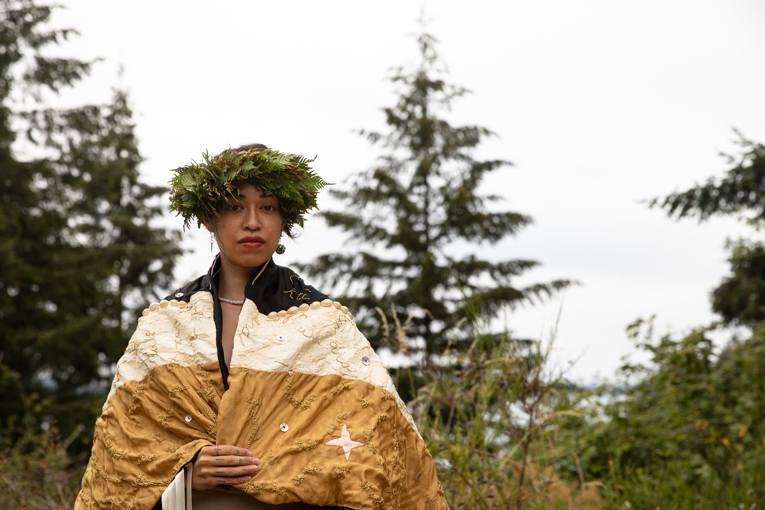 These tapestries, made from hand-stitched and beaten traditional Hawaiian barkcloth (kapa), speak to the ongoing histories of connection and exchange between Native Hawaiians and Indigenous communities in the Pacific Northwest, dating back to at least 1787. With Hawaiian quilt patterns representing plants from both Oregon and Hawaiʻi that carry deep cultural and ecological significance, these stories of relationship-building are told through the flora we grow alongside. In doing so, this piece also works to honor the original stewards of the land on which Portland State University is now located, including the Multnomah, Siletz, Wasco, Molalla, Kathlamet, Kalapuya, Atfalati, Chinook, and Cowlitz, among others.